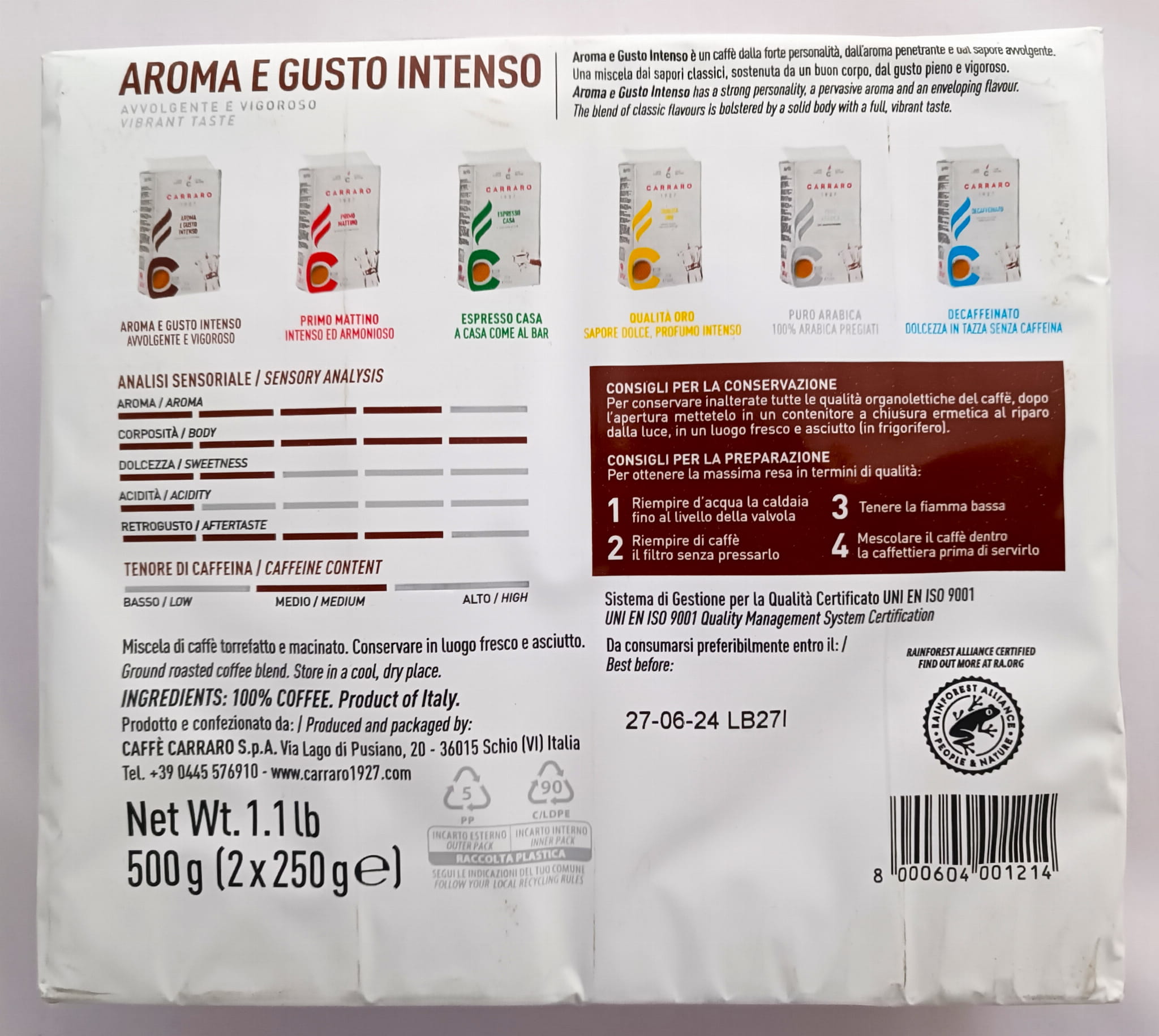 WŁOSKA KAWA CARRARO 2 X 250 G INTENSO